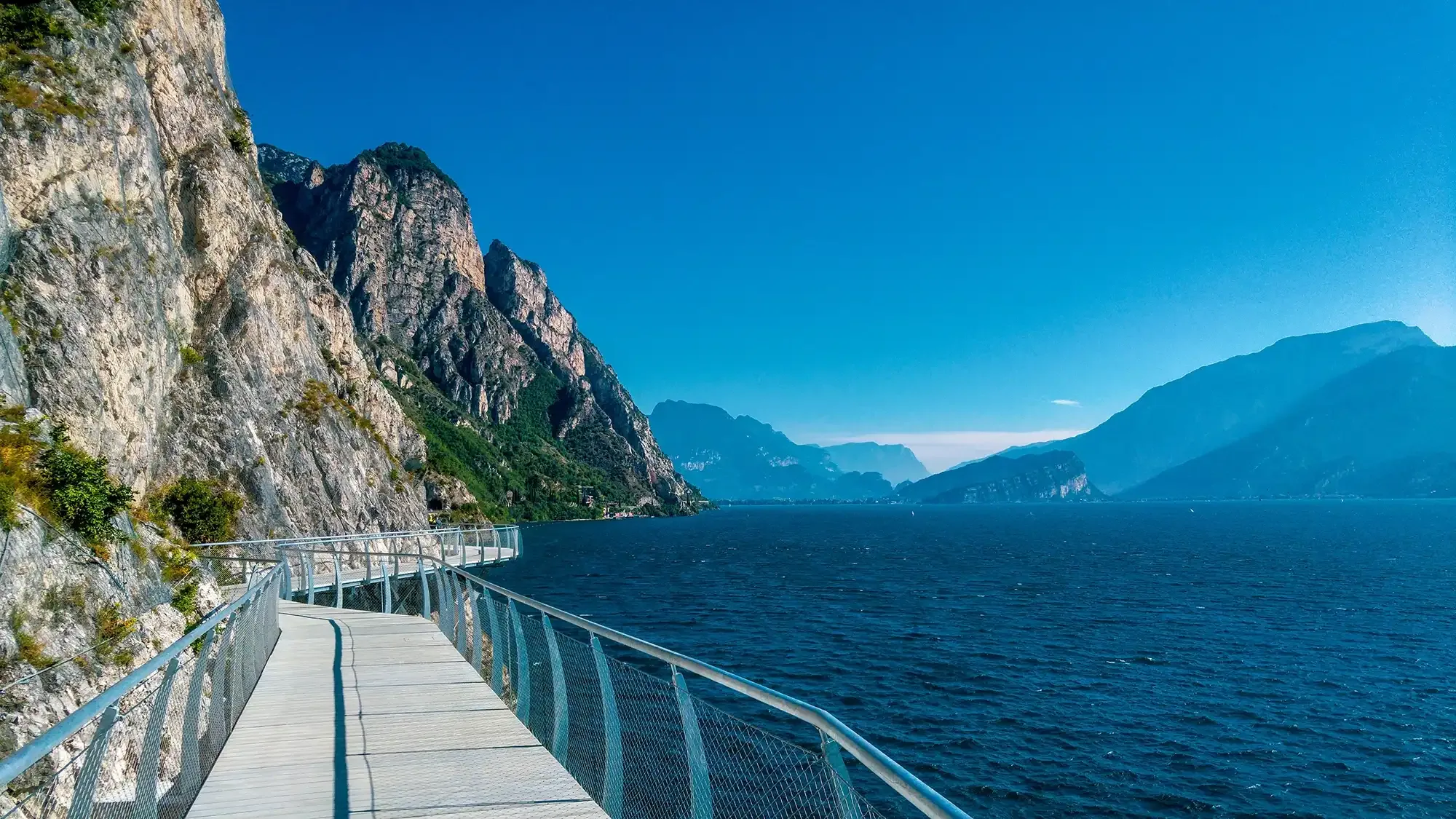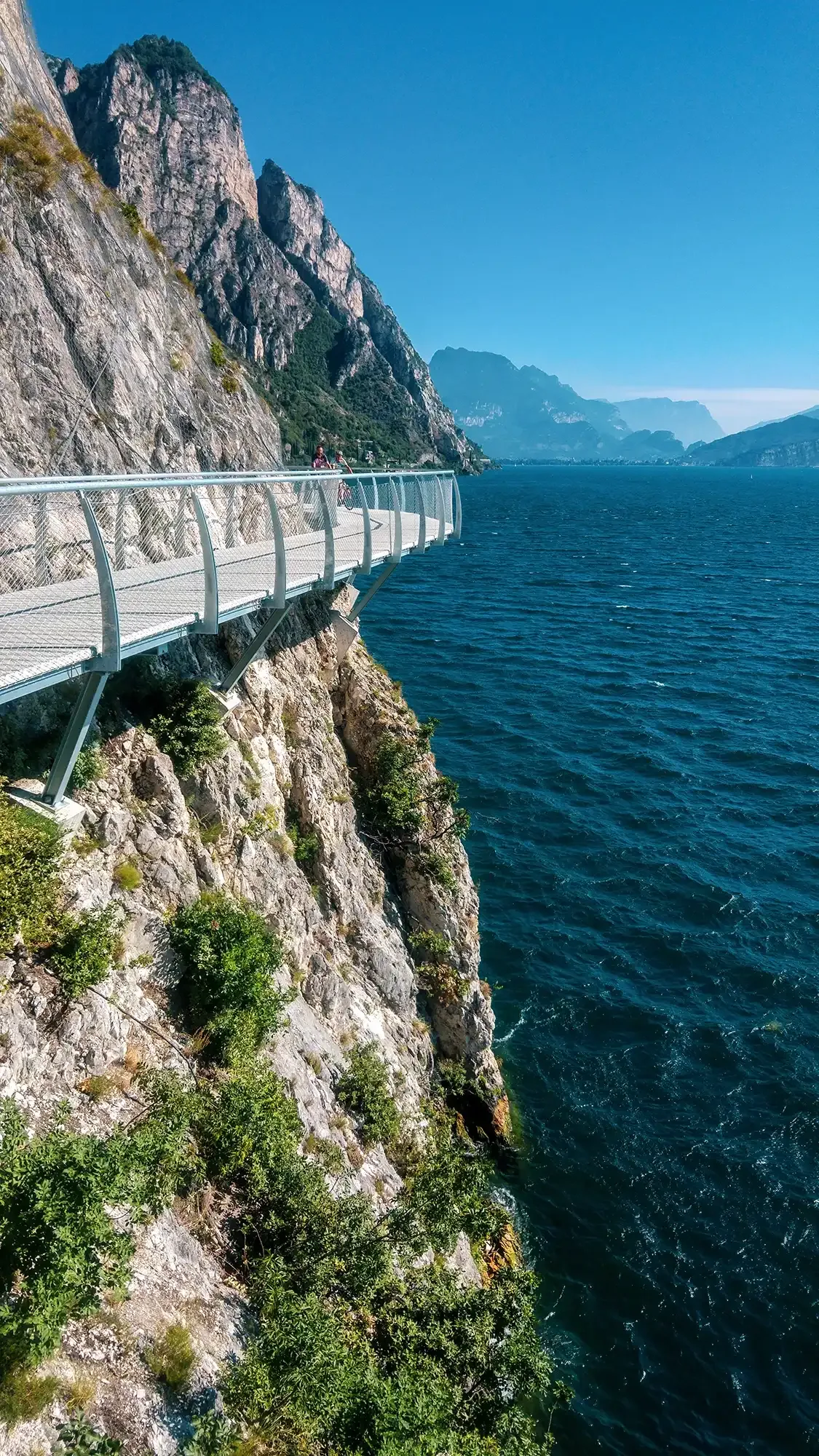 Sabato 14 luglio 2018 è una data che resterà nella storia del Lago di Garda: a Limone è stato inaugurato ufficialmente il nuovo tratto di pista ciclabile panoramica, lungo circa due chilometri, che raggiunge il confine con il Trentino. Un’opera unica e spettacolare, sospesa tra lago e cielo, che consente di vivere un’esperienza straordinaria sia a piedi che in bicicletta. Il percorso si sviluppa a sbalzo sul Lago di Garda, parallelo alla Strada Statale 45 bis, regalando una vista mozzafiato sulle acque e sulle montagne circostanti.